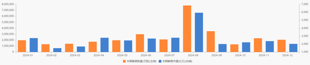 具体来看,7月,解禁公司386家,解禁市值达2746亿元;8月,将有多达781亿股限售股被释放进入流通领域,解禁市值近6000亿元,为2023年7月以来单月解禁新高;9月,356家公司解禁,市值2000亿元。